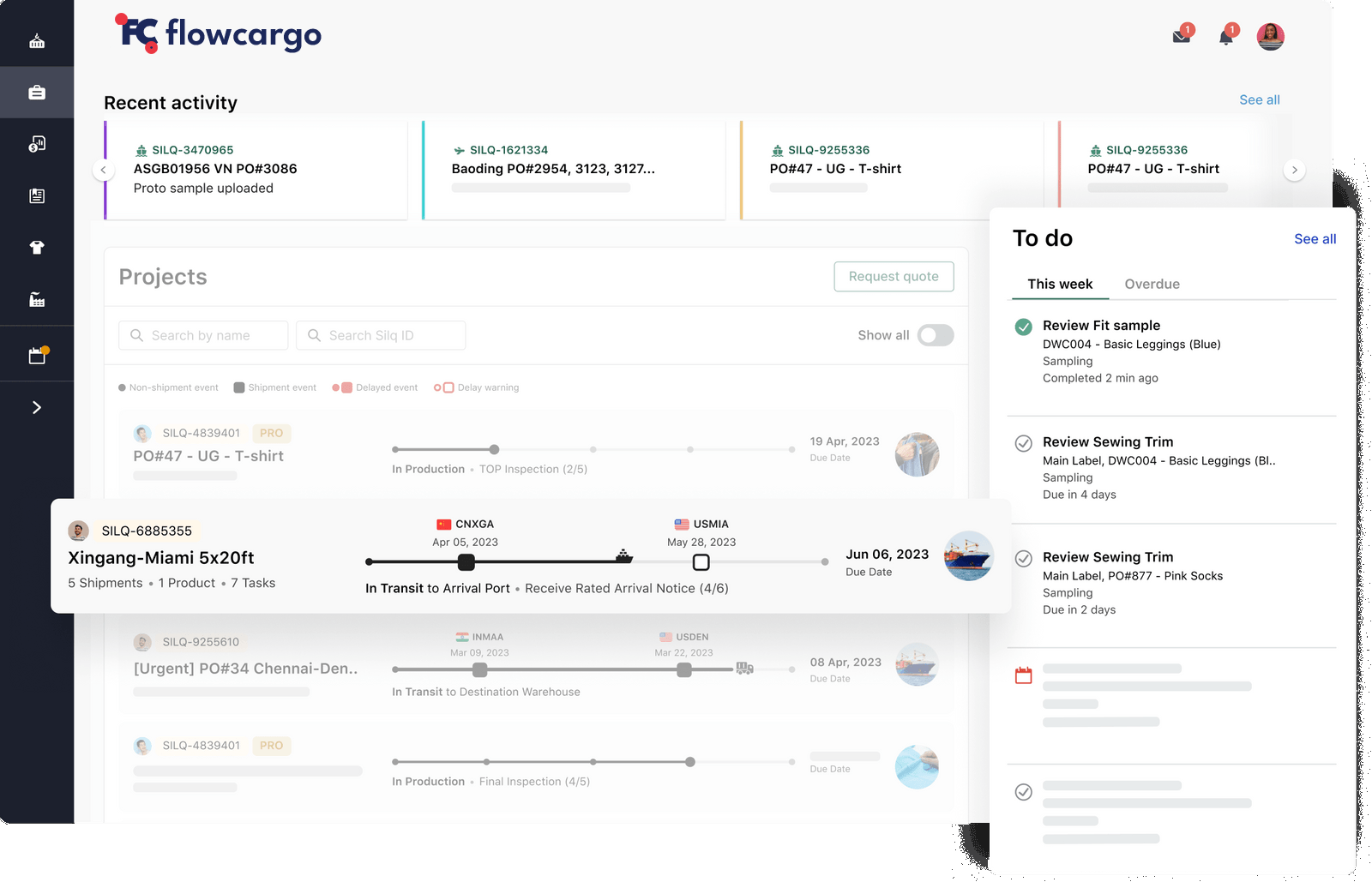 Shipments & Consolidation Platform All your orders in one place Manage, track, and simplify your supply chain with the Flowcargo Platform It all begins with planning View the latest tasks and updates from across your projects. All from the home page. Change your forwarder, not your workflows View the latest tasks and updates from across your projects. All from the home page. My Rates Access your rates whenever you want without ever chasing your forwarder.Just tell us the trade lanes that you’re most interested in and we’ll keep your rates up to date. Task Templates Configure shipment execution plans based on your personal preferences.Want to know when we make specific updates to your shipment? Just configure what matters to you and we’ll do the rest. Email Comments We meet you where you do your work. Whether via email or the Silq app, we track your comms in one place.CC the Silq project email address to any relevant email and we’ll add your message to our project comments. Track your projects Monitor progress every step of the way Milestones Time & Action Shipments Milestones Take control of you shipments by staying on top of your tasks Time & Action Leverage production data to plan your shipments Shipments Manage your cargo by tracking multiple shipments under the same PO ..and many more.. In-app quoting Shipping documents Network locations Task management Ready to ship without surprises? Let's connect! Please enable JavaScript in your browser to complete this form.Please enable JavaScript in your browser to complete this form. Email Email *GET STARTED